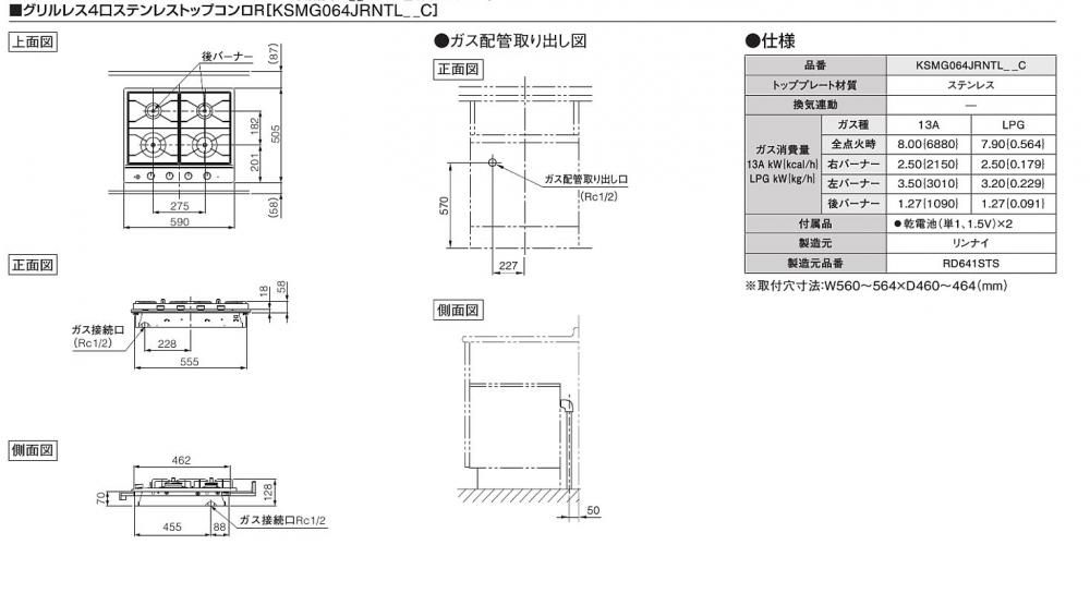リンナイ製(TOTO)KSMG064JRNTL__C グリルレス4口ステンレストップコンロR ●ガスコンロ