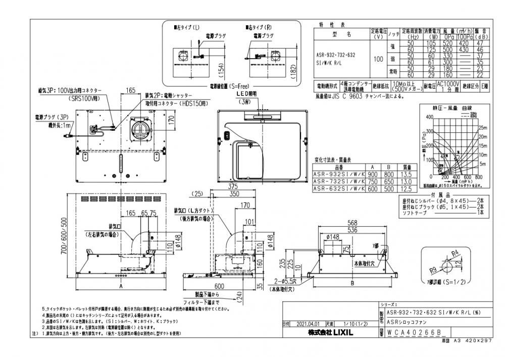 富士工業製(LIXIL) ASR-632W(R/L)J 間口60cm ホワイト 壁付用(I型・L型) ASRタイプ(奥行65・60cm共用)★レンジフード 上幕板付き