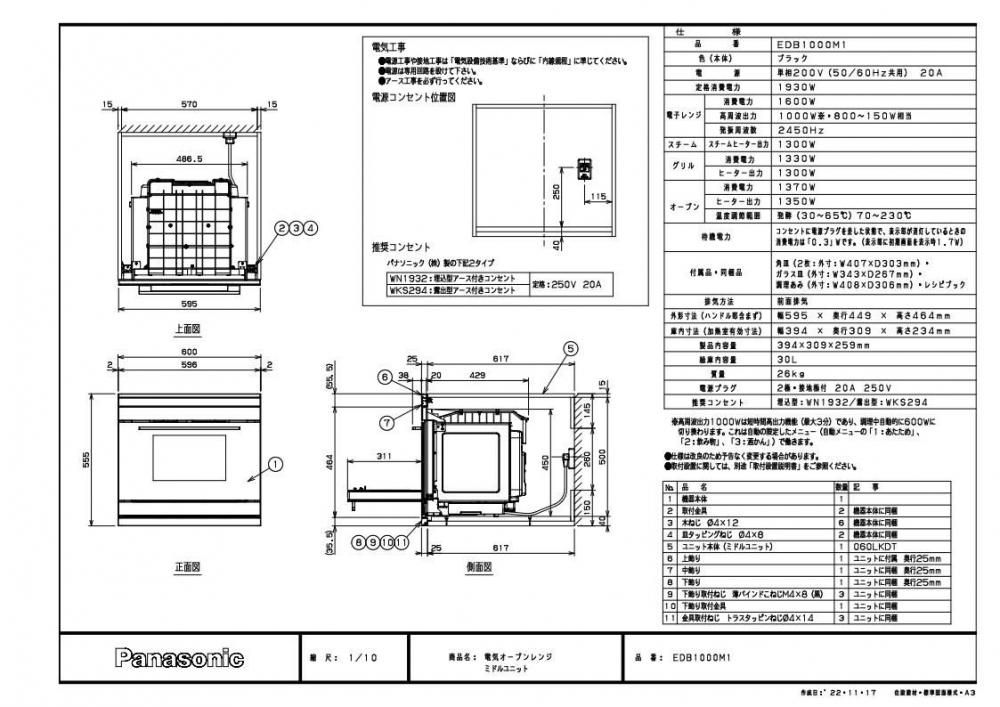 電気オーブン パナソニック製(Panasonic)JUGEDB1000M1 ビルトイン電気オーブンレンジ( 200V) ブラック