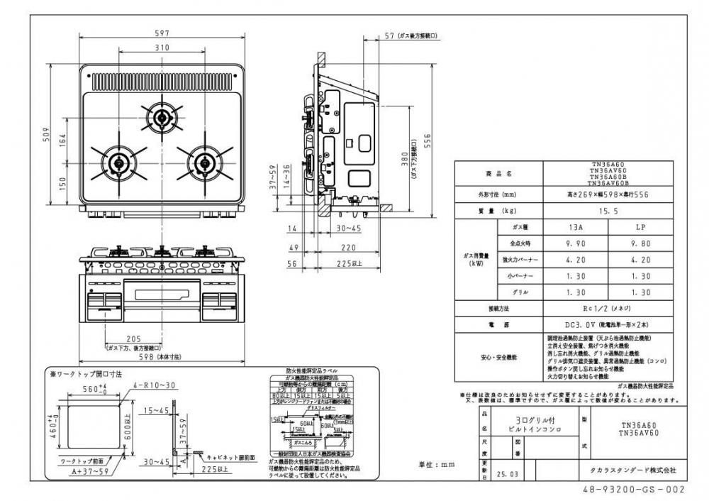 ガスコンロ タカラスタンダード TN36A60 ブラック ホーロートップ 3口コンロ  片面焼きグリル 幅60cm