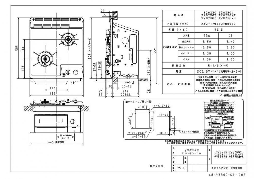 ガスコンロ タカラスタンダード T202EG  ホーロートッププレート 2口コンロ 片面焼きグリル 幅45cm ブラック