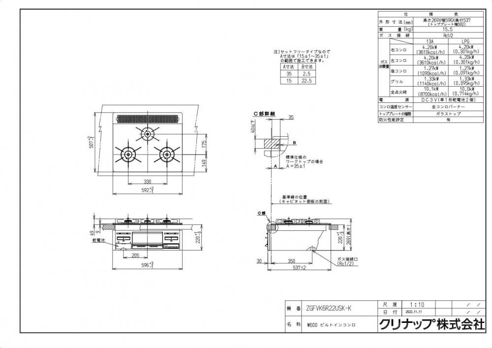 ガスコンロ クリナップ ZGFVK6R22USK-E 3口コンロ ガラストップタイプ 間口60cm