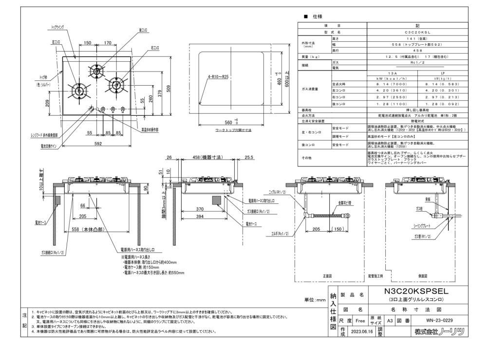 ガスコンロ ノーリツ製(NORITZ)N3C20KSPSEL Nero(ネロ)間口60cm 3口コンロ ブラックガラストップ