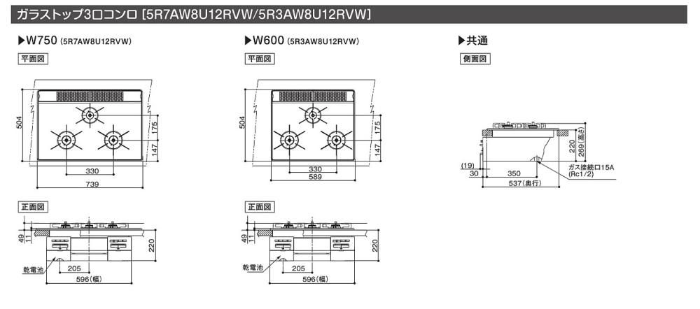 ガスコンロ リンナイ製(TOCLAS)5R3AW8U12RVW ラインシルバー ガラストップ 3口コンロ 間口60cm