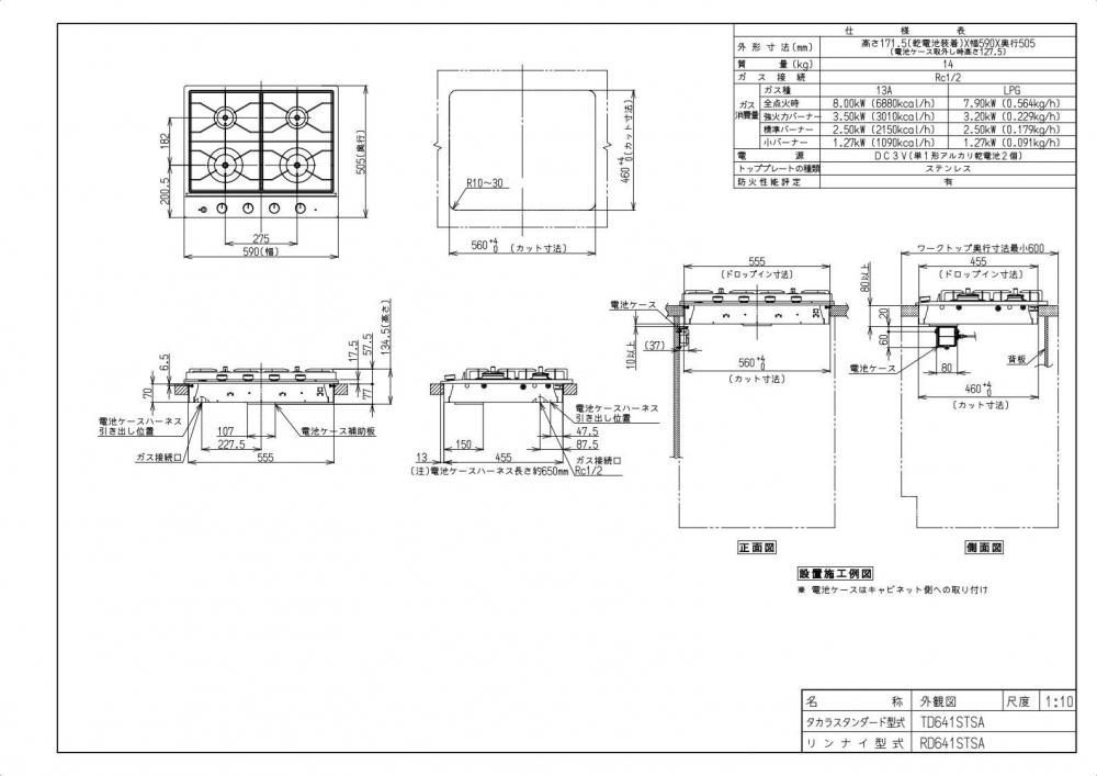 ガスコンロ タカラスタンダード TD641STSA グリルレスタイプ 4口コンロ 幅60cm シルバー