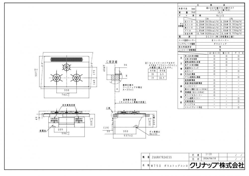 ガスコンロ クリナップ ZGGRK7R24ESS-K ガラストップコンロ 3口コンロ 間口75cm