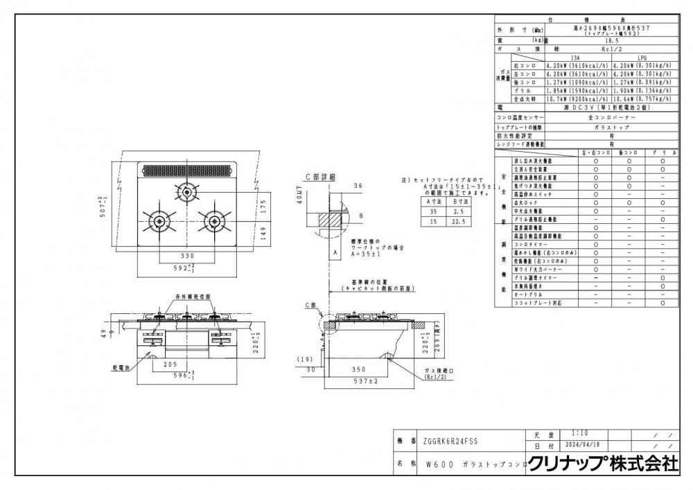 ガスコンロ クリナップ ZGGRK6R24FSS-K ガラストップコンロ 3口コンロ 間口60cm