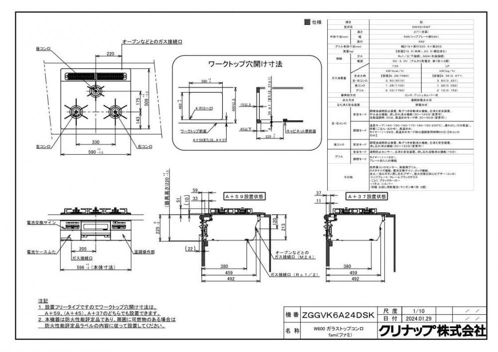 ガスコンロ クリナップ ZGGVK6A24DSK-E ガラストップコンロ 3口コンロ 間口60cm