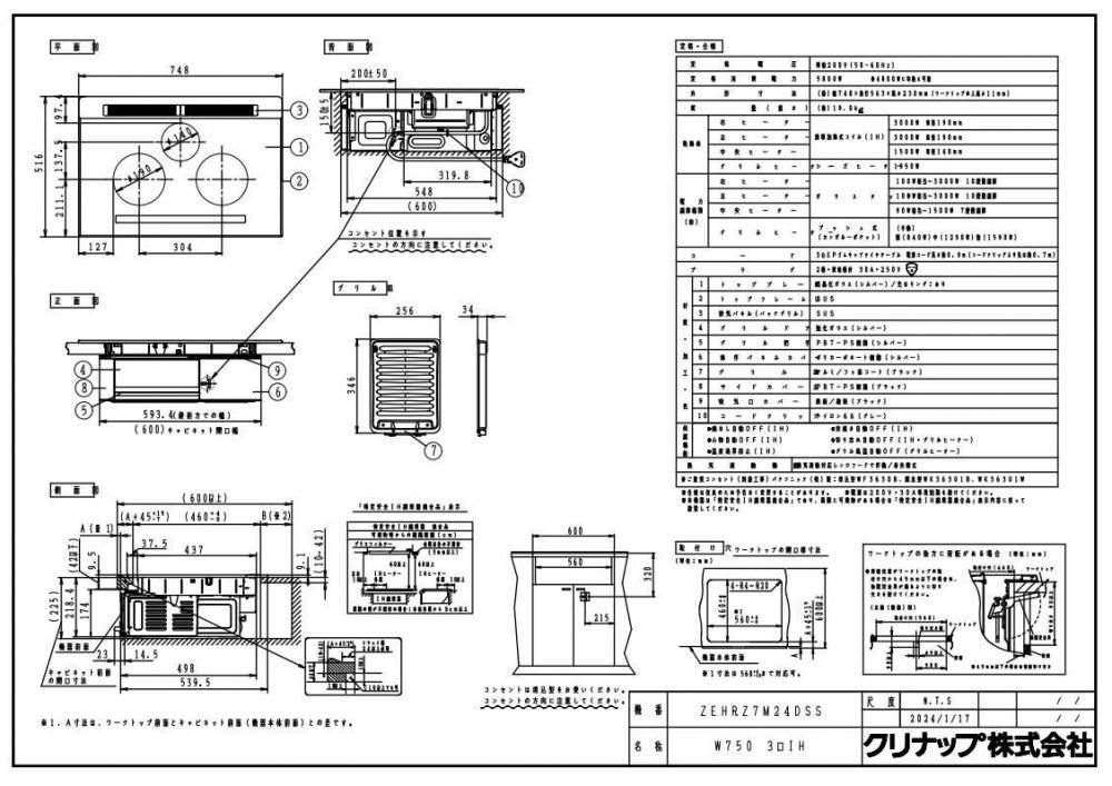 IHクッキングヒーター クリナップ ZEHRZ7M24DSS 間口75cm 3口IHヒーター シルバー