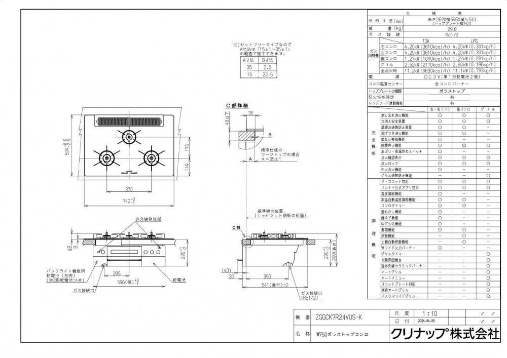 ガスコンロ クリナップ ZGGCK7R24VUS-K ガラストップコンロ DEILCIA(デリシア)3口コンロ 間口75cm
