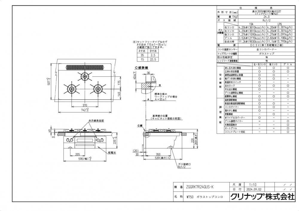 ガスコンロ クリナップ ZGGRK7R24QUS-K ガラストップコンロ Lisse(リッセ)3口コンロ 間口75cm