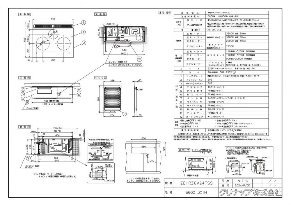 IHクッキングヒーター クリナップ ZEHRZ6M24TSS 3口IHヒーター 間口75cm シルバー
