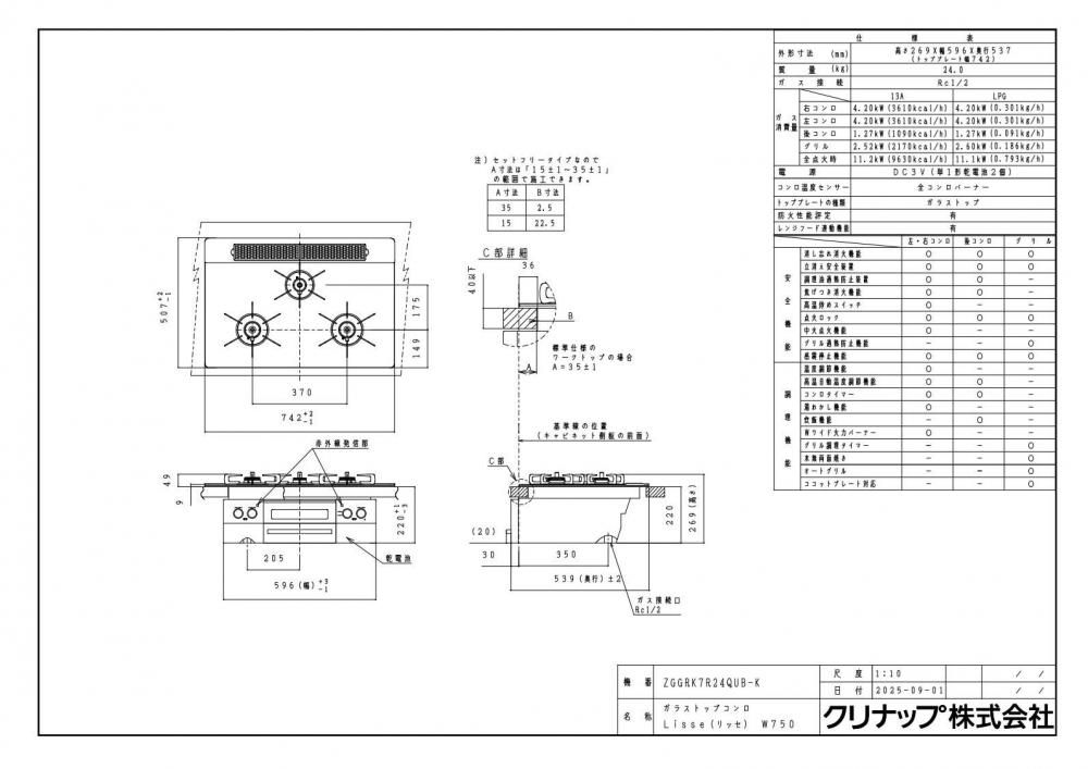 ガスコンロ クリナップ ZGGRK7R24QUB-K ガラストップコンロ Lisse(リッセ)3口コンロ 間口75cm