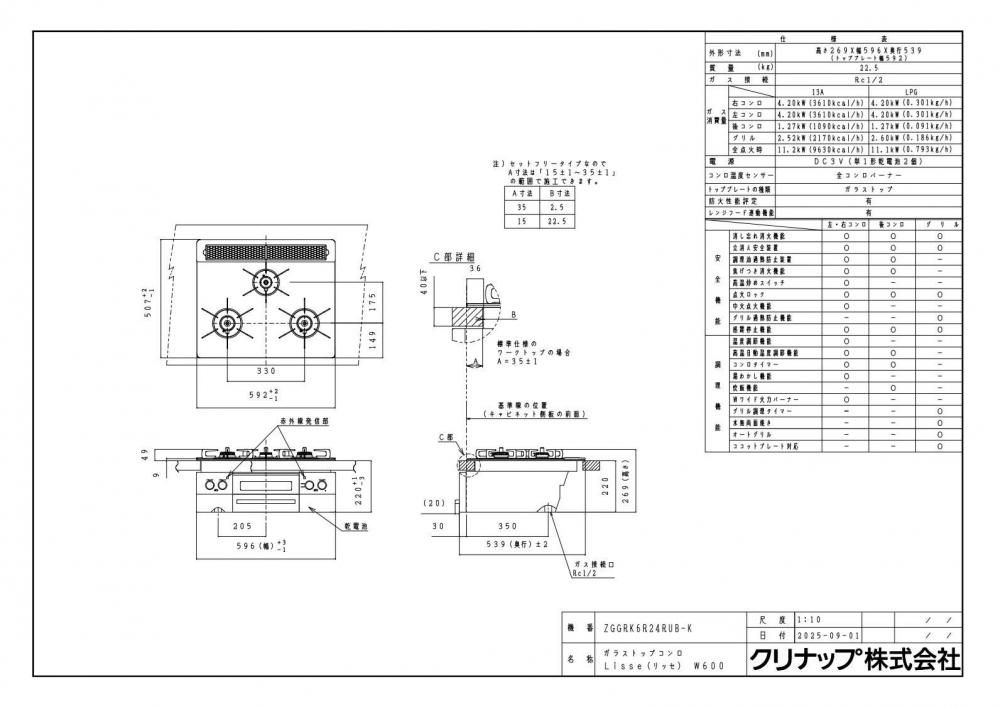 ガスコンロ クリナップ ZGGRK6R24RUB-K ガラストップコンロ Lisse(リッセ)3口コンロ 間口60cm