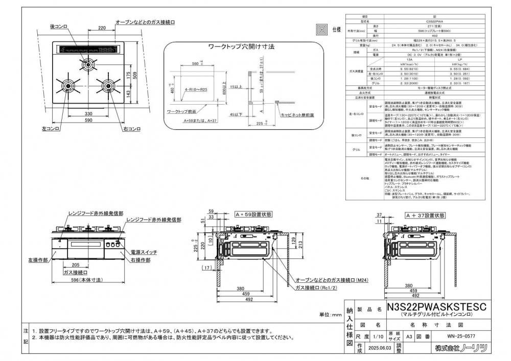 ガスコンロ ノーリツ製(NORITZ)N3S22PWASKSTESC PROGRE(プログレ)間口60cm ステンレスごとく プラチナシルバー