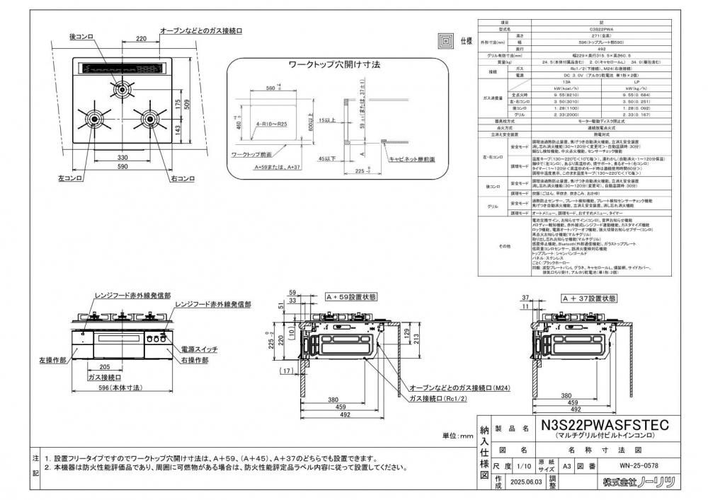 ガスコンロ ノーリツ製(NORITZ)N3S22PWASFSTEC PROGRE(プログレ)間口60cm ブラックホーローごとく シャンパンゴールド
