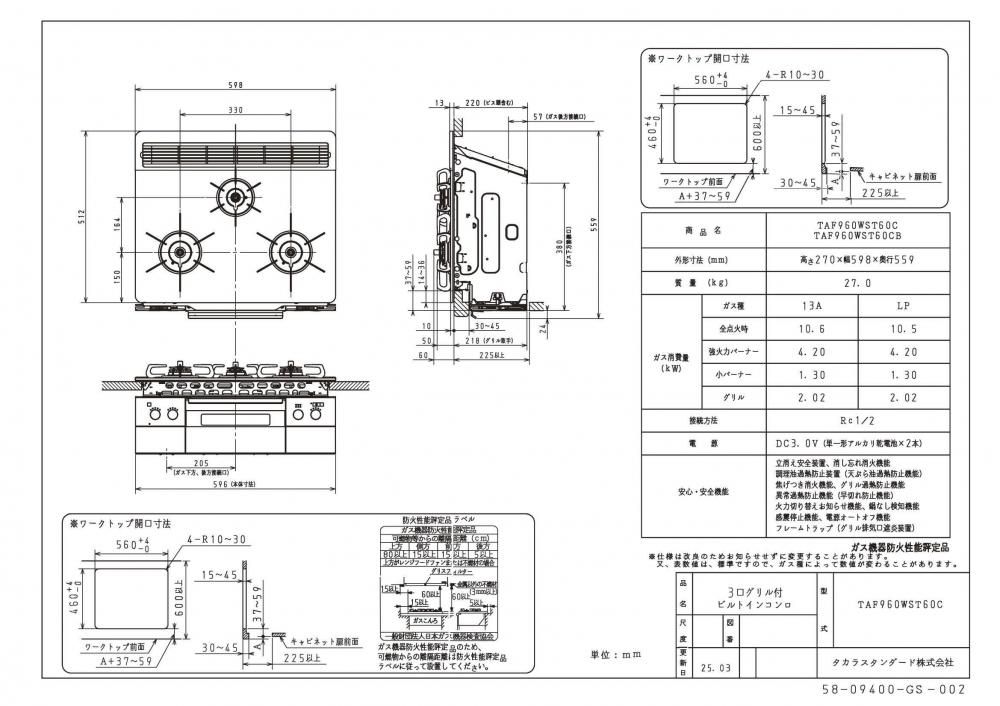 ガスコンロ タカラスタンダード TAF960WST60C ハイパーガラスコート トッププレート ハイグレードモデル 3口コンロ 幅60cm オーブン対応