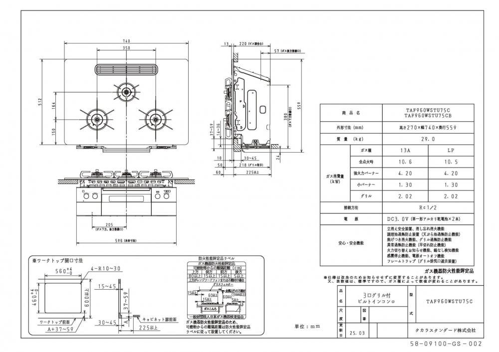 ガスコンロ タカラスタンダード TAF960WSTU75C ハイパーガラスコート トッププレート ハイグレードモデル 3口コンロ 幅75cm オーブン非対応