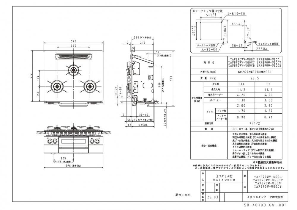 ガスコンロ タカラスタンダード TAF890W-U60C ハイパーガラスコート トッププレート 3口コンロ グラファイトブラック 幅60cm オーブン非対応