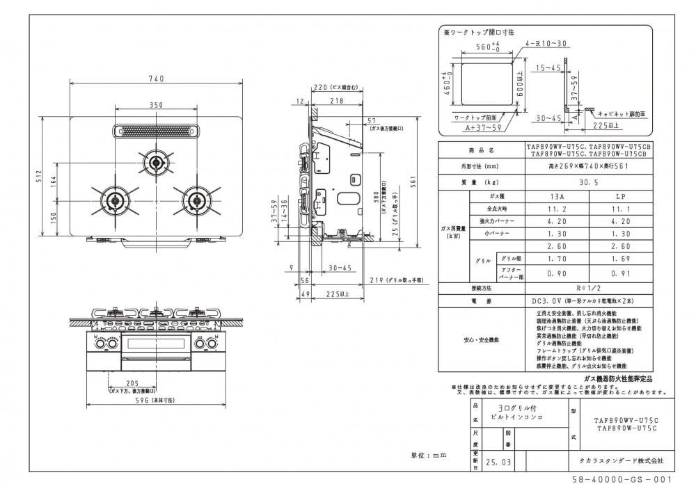 ガスコンロ タカラスタンダード TAF890W-U75C ハイパーガラスコート トッププレート 3口コンロ グラファイトブラック 幅75cm オーブン非対応