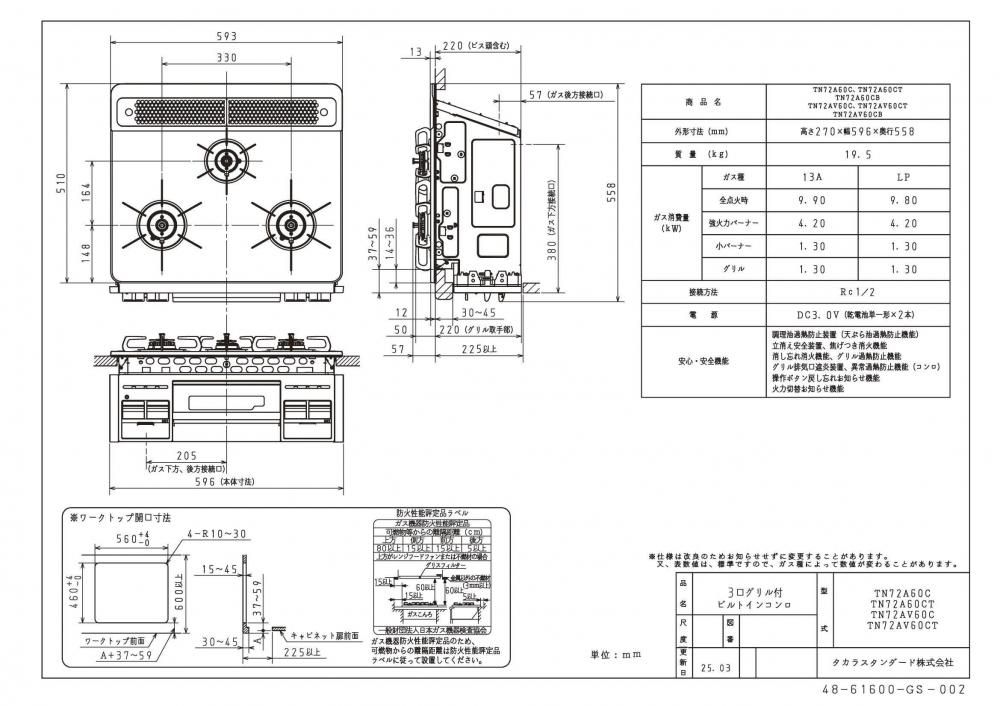 ガスコンロ タカラスタンダード TN72AV60C ハイパーガラスコート トッププレート 3口コンロ シルバー 幅60cm