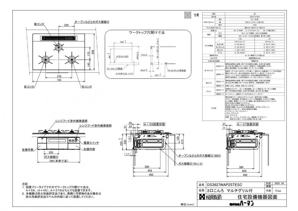ガスコンロ ハーマン製(HARMAN) DS3627WAP2STESC PROGRE(プログレ) 3口コンロ 間口75cm クレールシルバー
