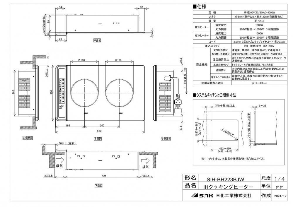 IHクッキングヒーター 三化工業製(三化工業)SIH-BH223BJW-B ブラック  2口IH 横置型(上面操作タイプ)200V